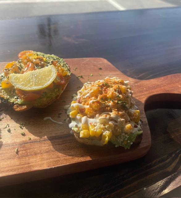 🌶️ Some Like It Spicy – A bold, flavorful toast with roasted corn, Elote seasoning, cotija cheese, Mexican cream, and chili pepper flakes.